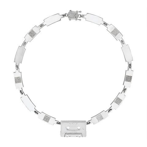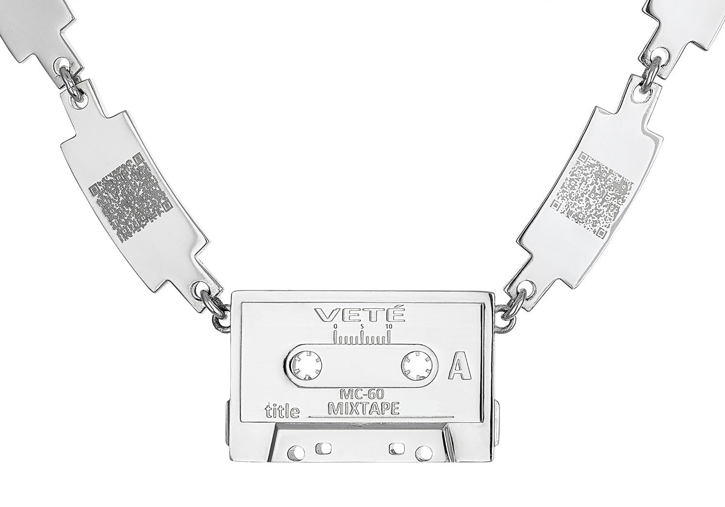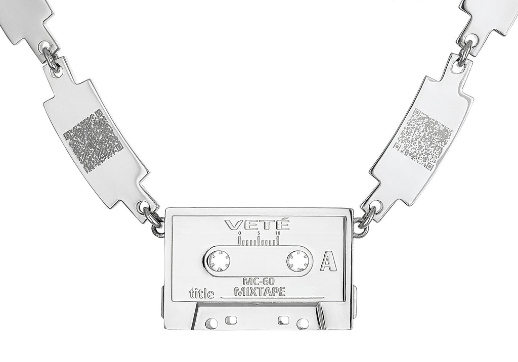 THE MIX TAPE CHAIN IS A CUSTOMIZABLE .925 STERLING SILVER CHAIN FEATURING A MC-60 MCIRO CASSETTE PENDANT WITH LINKS ETCHED WITH SPOTIFY QR CODES.